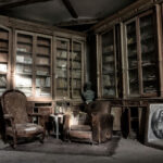 Cette photographie artistique capte un moment suspendu dans un lieu empreint d’histoire, de silence et de mystère. L’image nous plonge dans une bibliothèque ancienne à l’abandon, où chaque élément semble raconter une histoire oubliée. La composition, centrée sur deux fauteuils fatigués et un petit guéridon, suggère une intimité disparue – peut-être celle de penseurs, de lecteurs ou d’âmes solitaires jadis réunies ici.