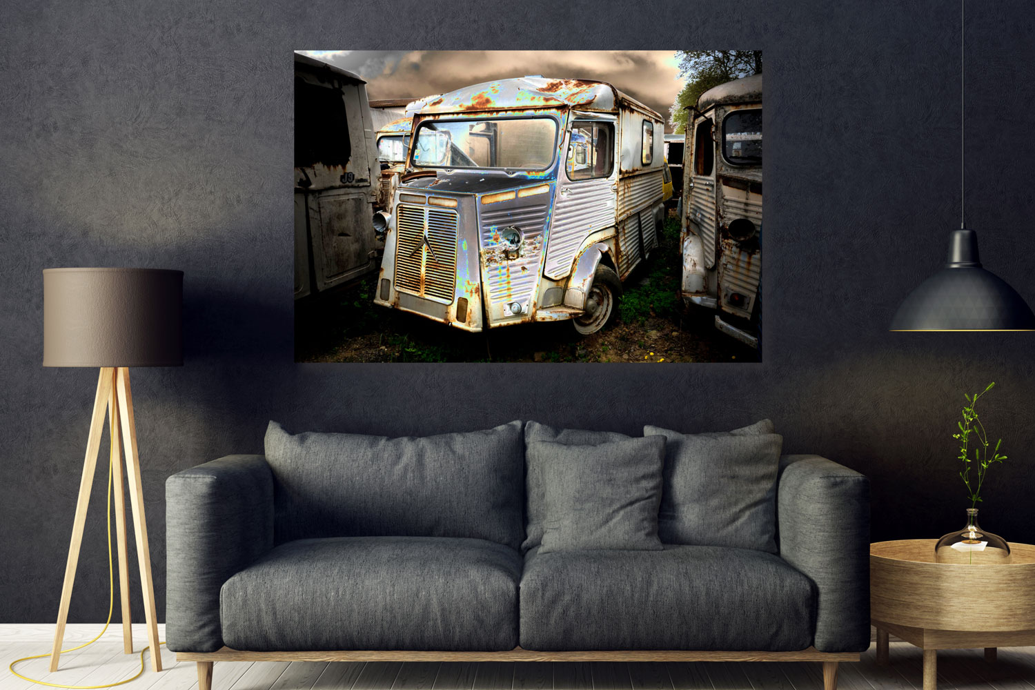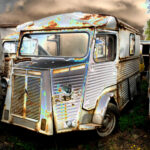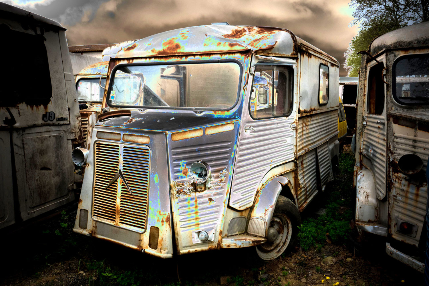 Sous un ciel chargé de nuages dramatiques, une rangée de vieux fourgons Citroën Type H, rongés par la rouille, repose dans le silence d’une casse oubliée. Le véhicule au premier plan, cabossé, son phare droit manquant et sa carrosserie striée de cicatrices métalliques, semble figé dans un dernier souffle. Les traces de corrosion, mêlées à des éclats irisés de peinture délavée, créent une palette inattendue, presque picturale, où l’oxydation devient une forme d’art brut.