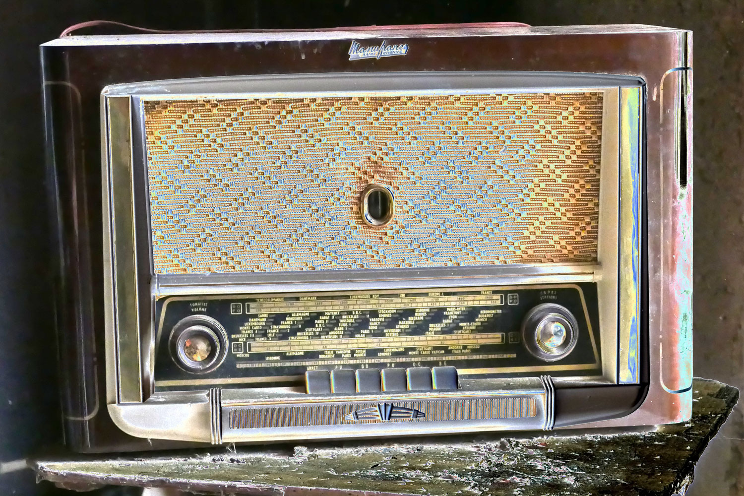 Cette photographie présente une radio ancienne posée sur une surface abîmée, comme un vestige figé dans le temps. L’objet, marqué par l’usure, garde pourtant une noblesse rétro : façade dorée tissée de motifs géométriques, boutons patinés, cadran illuminé de noms de villes et de fréquences oubliées. On imagine les voix et les musiques d’autrefois qui résonnaient dans son coffret en bois sombre, aujourd’hui réduit au silence.