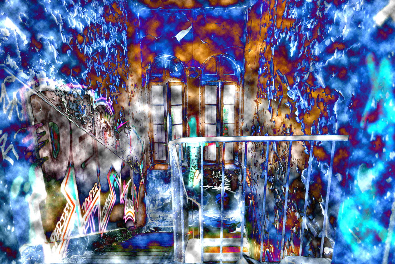 Cette photographie plonge le spectateur dans un univers onirique et troublant, où les murs décrépis deviennent des toiles abstraites. La cage d’escalier, lieu de passage et de transition, se métamorphose ici en espace presque psychédélique, saturé de couleurs intenses et inversées : le bleu électrique se mêle à l’orange incandescent, le blanc éclatant contraste avec les ombres profondes.