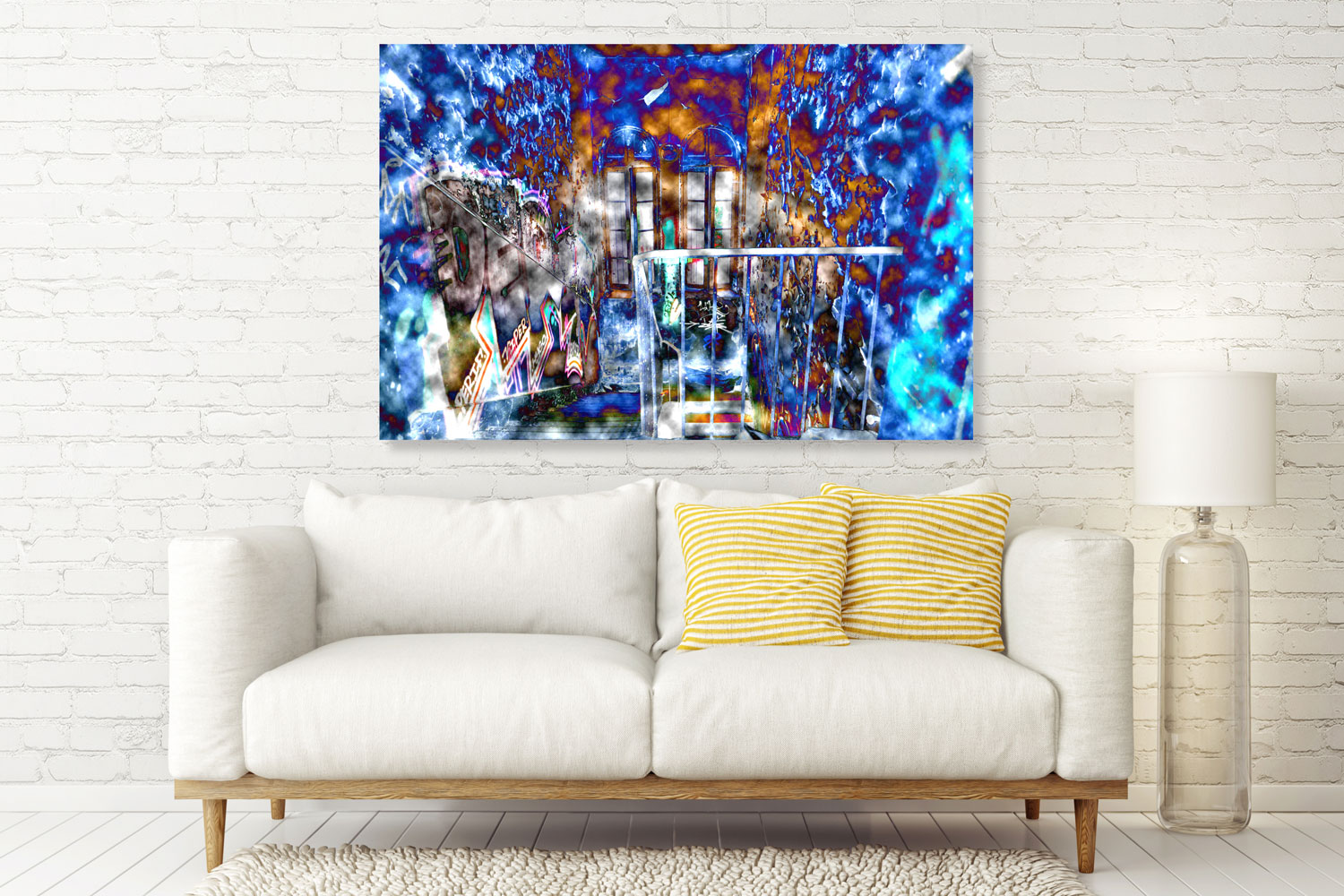 Les murs, écaillés et recouverts de graffitis, témoignent d’un temps qui s’effrite, mais la transformation colorimétrique leur donne une nouvelle vie, presque vibrante. Les fenêtres, au fond, laissent filtrer une lueur spectrale, évoquant une issue vers un ailleurs incertain — peut-être une délivrance, peut-être une illusion.