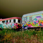 Cette photo capture une scène urbaine singulière, où la nature et l’art de rue se rencontrent. Deux wagons de train abandonnés, rongés par le temps, se dressent au milieu d’une végétation sauvage. Leur surface, jadis terne et industrielle, est aujourd’hui métamorphosée en une toile éclatante de couleurs vives.