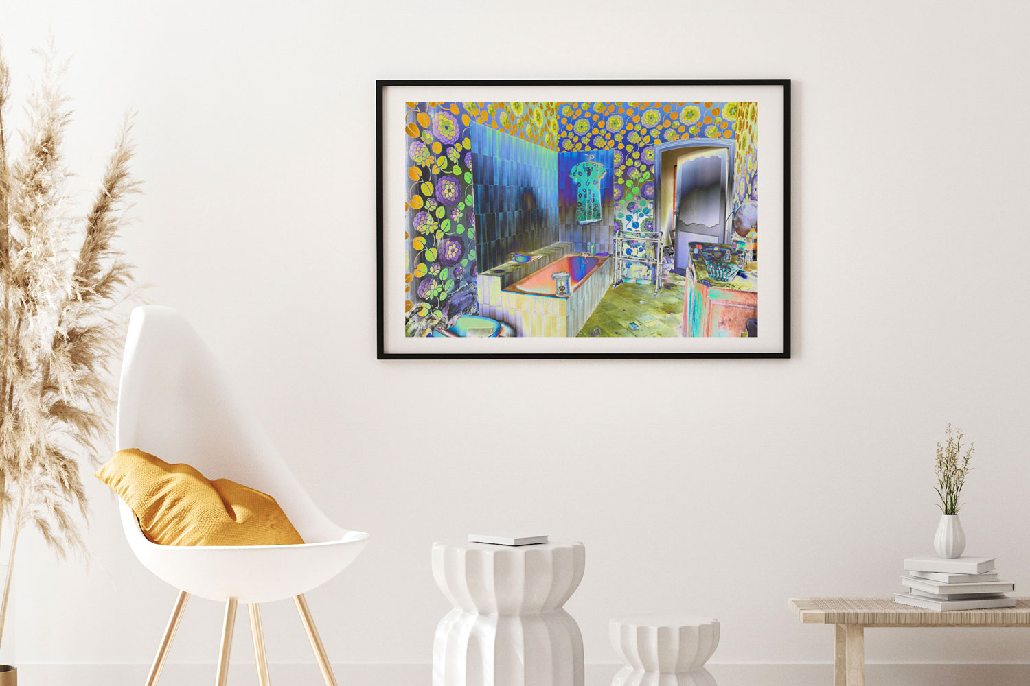 Salle de bain figée dans le temps, cette image explose en couleurs psychédéliques, comme si le spectre lumineux avait été inversé pour révéler une réalité parallèle. Les murs, recouverts d’un papier peint floral rétro, saturent l’espace de motifs hypnotiques — fleurs oranges, vertes, violettes, jaunes — créant un contraste saisissant avec la froideur géométrique des carreaux muraux.