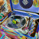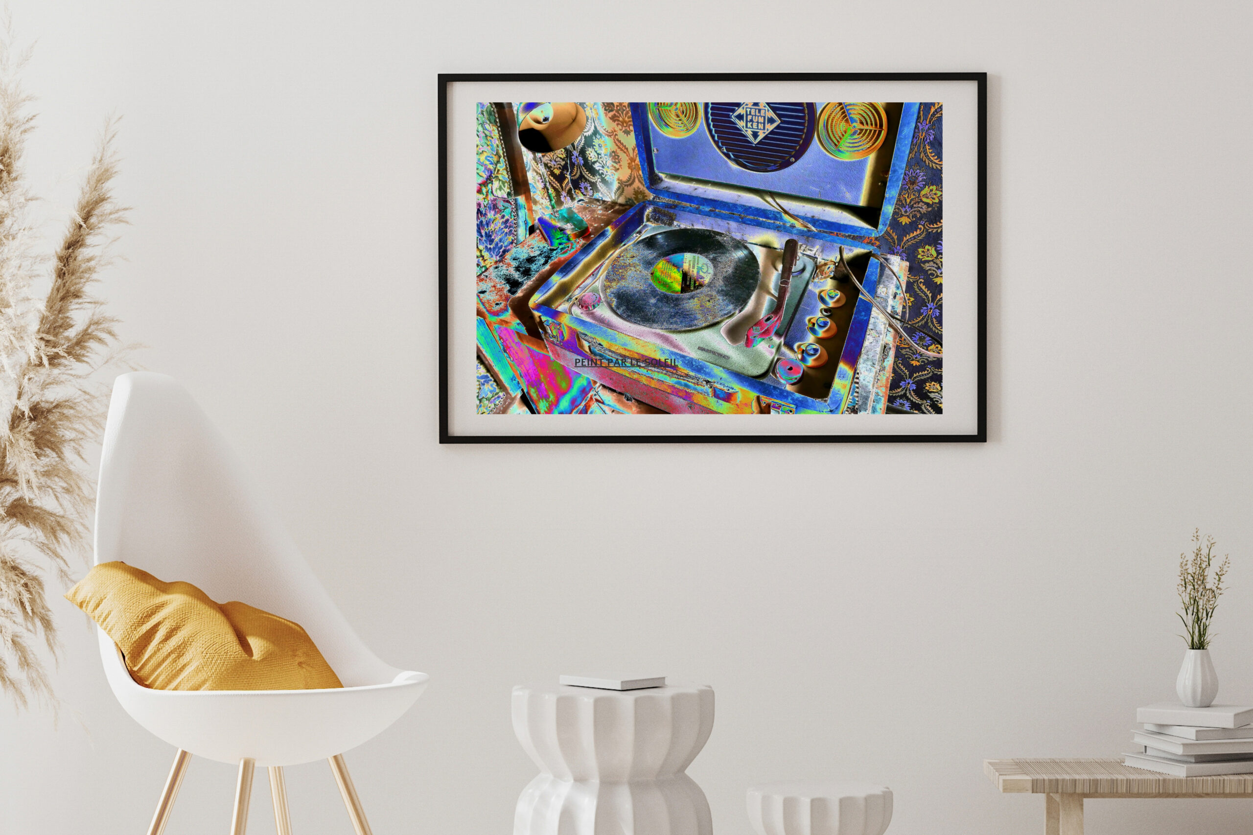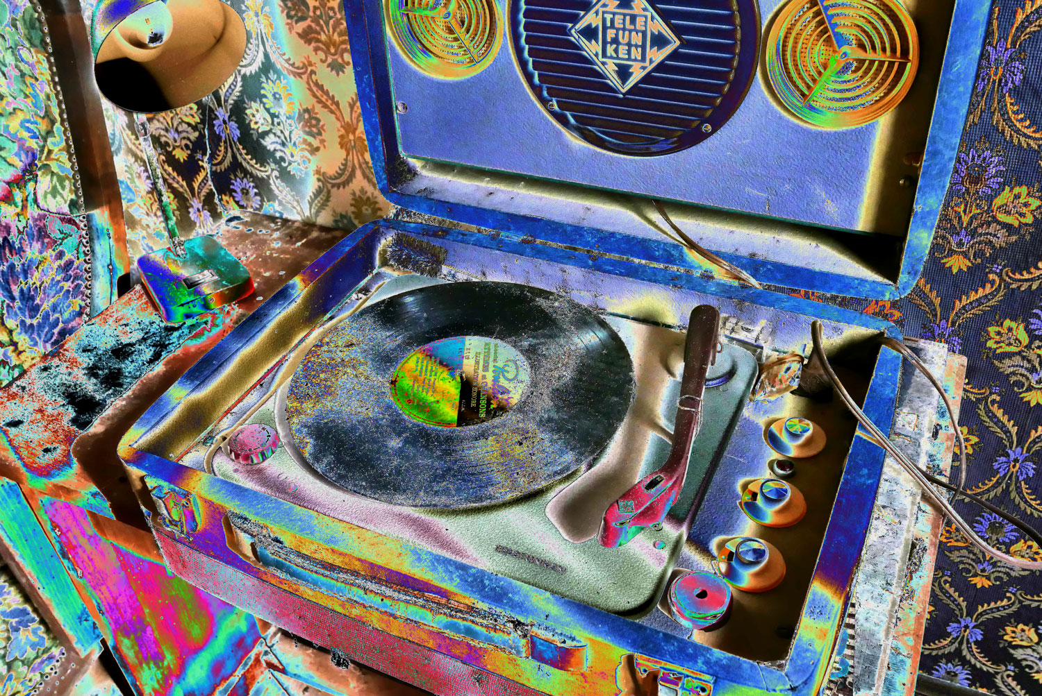 Cette image dégage une atmosphère presque psychédélique, comme si le temps avait été distordu à travers un prisme coloré. On y voit un tourne-disque ancien, posé dans son écrin bleu, sur une table entourée de papiers peints aux motifs baroques. Le sillon du vinyle, chargé de poussière, évoque à la fois la nostalgie et l’abandon, tandis que les couleurs saturées et inversées transforment la scène en vision hallucinée.