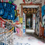 Cette photographie capture l’âme brute d’un lieu abandonné, envahi par les graffitis et les couleurs criardes laissées par des générations d’artistes urbains. Le regard est happé par le contraste entre l’escalier de fer forgé, vestige élégant d’une architecture passée, et la déferlante sauvage des tags qui recouvrent chaque surface disponible.