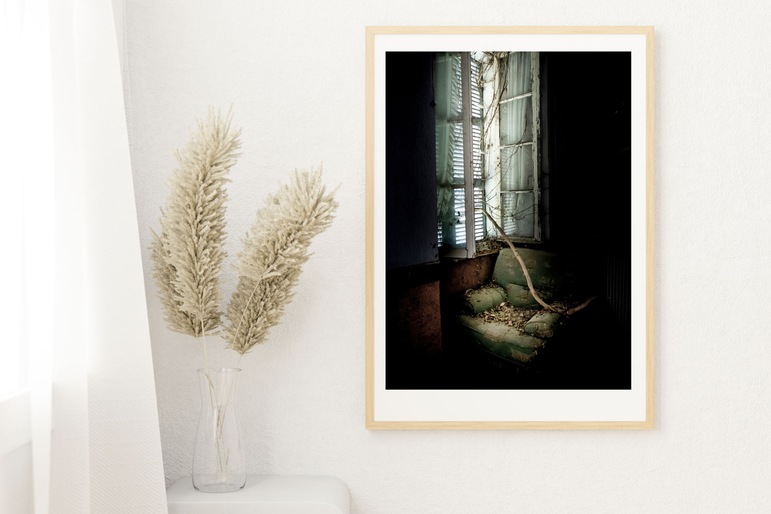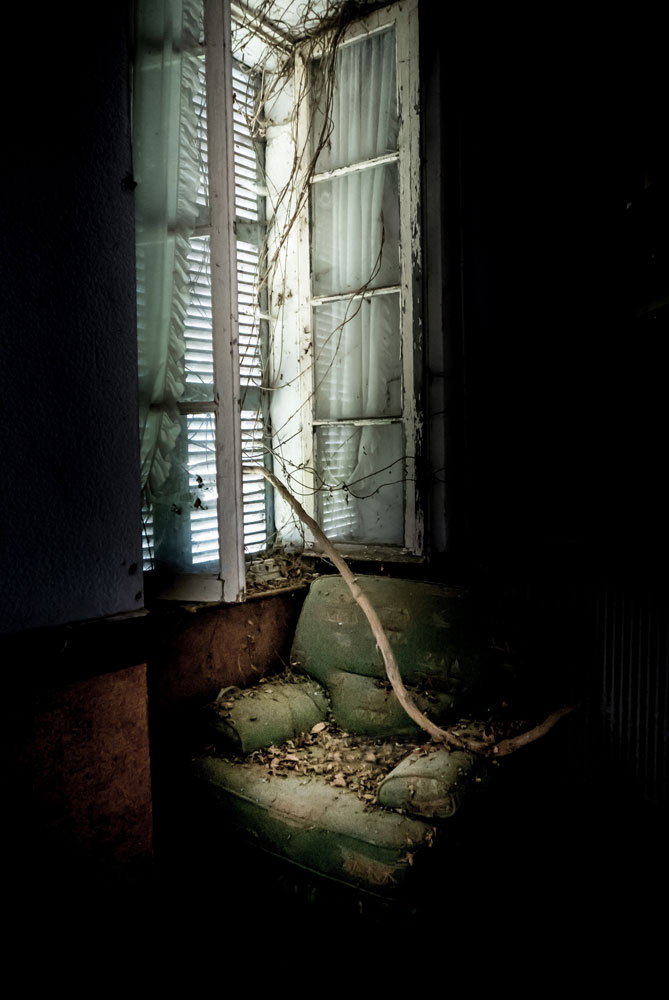Cette photographie offre une scène intimiste, presque théâtrale, où la lumière et la nature dialoguent dans un silence suspendu. Elle capture un coin oublié d’une pièce : un vieux fauteuil vert, abîmé, envahi par la poussière, les feuilles mortes, et les racines rampantes d’une plante sauvage ayant pénétré par la fenêtre. Le cadre évoque une rencontre poignante entre l’abandon humain et la persistance organique.