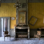Dans cette pièce oubliée, figée dans une suspension temporelle, le passé murmure encore à travers chaque détail : le papier peint jauni, les cadres inclinés, les chaises dépareillées aux assises fatiguées, et la cheminée poussiéreuse trônant en silence. L’espace semble figé dans un entre-deux, ni tout à fait vivant, ni totalement abandonné, comme un décor d’attente, chargé d’histoires muettes.