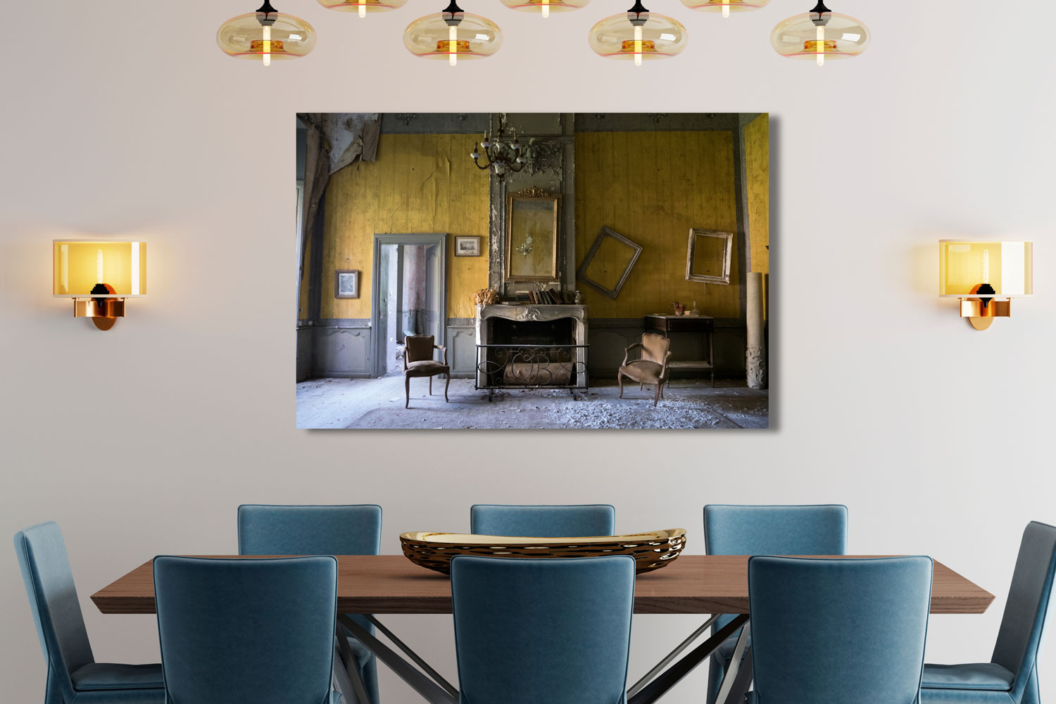 Le jaune vieilli des murs, presque doré, contraste avec les ombres bleutées du mobilier décrépi, créant une atmosphère baroque fanée où le temps semble avoir posé sa main sur chaque objet sans les effacer. Les cadres vides, penchés comme s’ils avaient glissé de leur mémoire, témoignent d’une absence parlante : l’absence des visages, des récits, de la vie d’avant.