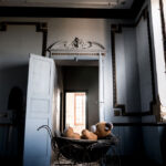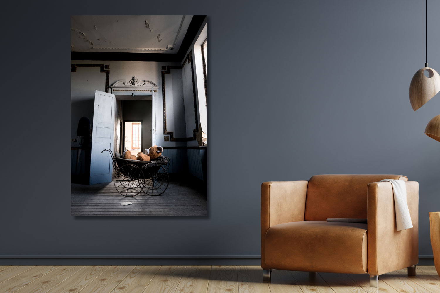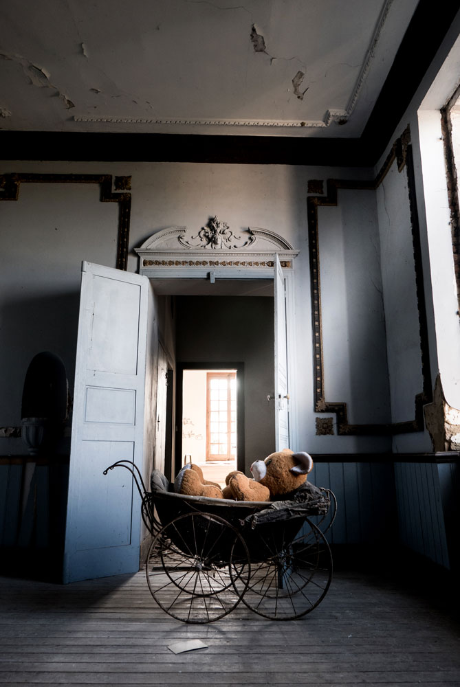 Un souffle du passé hante cette pièce silencieuse, où chaque fissure raconte une histoire oubliée. Au cœur de cet ancien salon délaissé, une poussette d’un autre siècle repose, ses roues fines rouillées par le temps. À l’intérieur, un grand ours en peluche semble abandonné là, comme une mémoire de l’enfance laissée en suspens. Trop grand pour son écrin, il repose sur le dos, paisible mais déplacé, évoquant une tendresse perdue dans un décor devenu étranger.