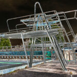 Les structures oxydées, figées dans le temps, semblent transformer cet ancien lieu de loisirs en une architecture fantomatique, presque futuriste dans son apparence inversée et glacée. La lumière, accentuant les contours du métal, fait du plongeoir une sorte de squelette géométrique, une cathédrale vide dédiée à un culte disparu : celui du jeu, de l’eau et du mouvement.